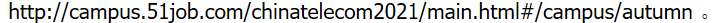 以上流程及信息若有变动,敬请关注中国电信集团有限公司——“招贤纳士”专栏、前程无忧合作网站、和中国电信校园招聘微信公众号(搜索“中国电信校园招聘”或“中国电信校招速递”),浏览最新的校招信息。