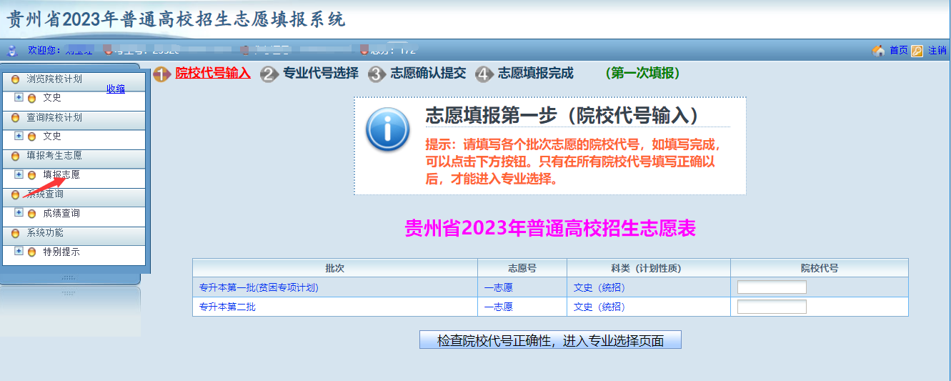 2.考生按照本人事先预填的志愿,输入院校代号,点击“检查院校代号正确性”按钮,进入下个页面。(图-8)