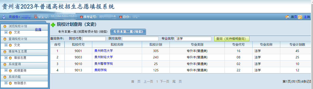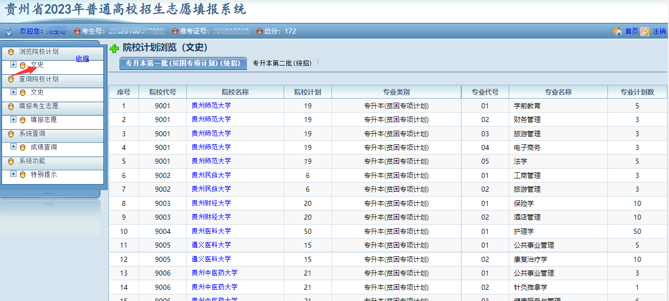 7.文化上线的原贵州省户籍的建档立卡贫困家庭的考生,同时填报专升本第一批(贫困专项计划)和专升本第二批(普通批次)两个批次志愿时,两个批次志愿所填报的学校必须是同一所学校,且所填报的是专业相同或专业考试科目相同的两个专业(以招生院校公布的招生章程为准)。若考生两个批次志愿所填报的学校不是同一所学校,或虽为同一所学校但所填报的两个专业的专业考试科目不同,则考生只能参加专升本第二批(普通批次)的专业考试,所填报的专升本第一批(贫困专项计划)志愿无效。