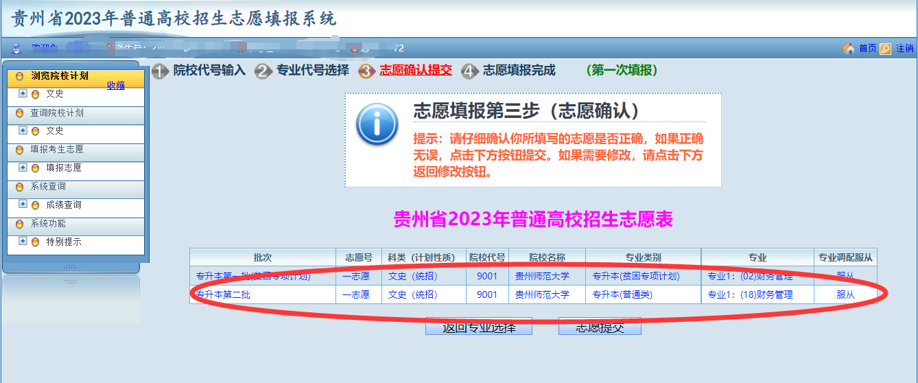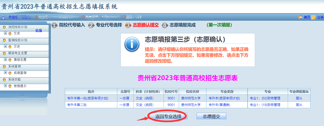 在检查过程中如果发现错误,请点击页面下方的“返回专业选择”按钮进行修改。(图-15)